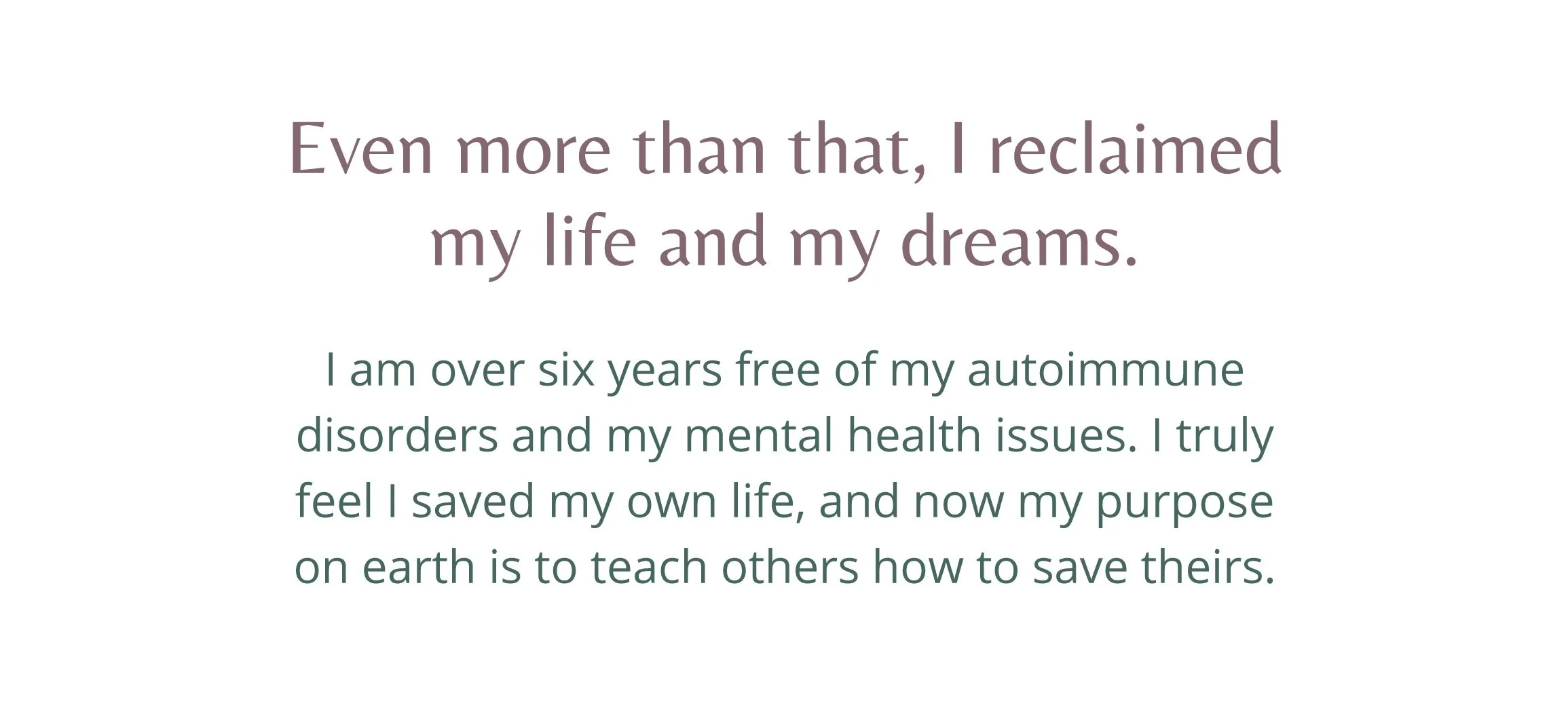 Within two months, my autoimmune disorders and mental health conditions cleared up and resolved naturally. I started to see the sun shining again, I began to see hope in my life, I got my energy back, my pain went away, and I could finally eat any food I wanted to without issues.
